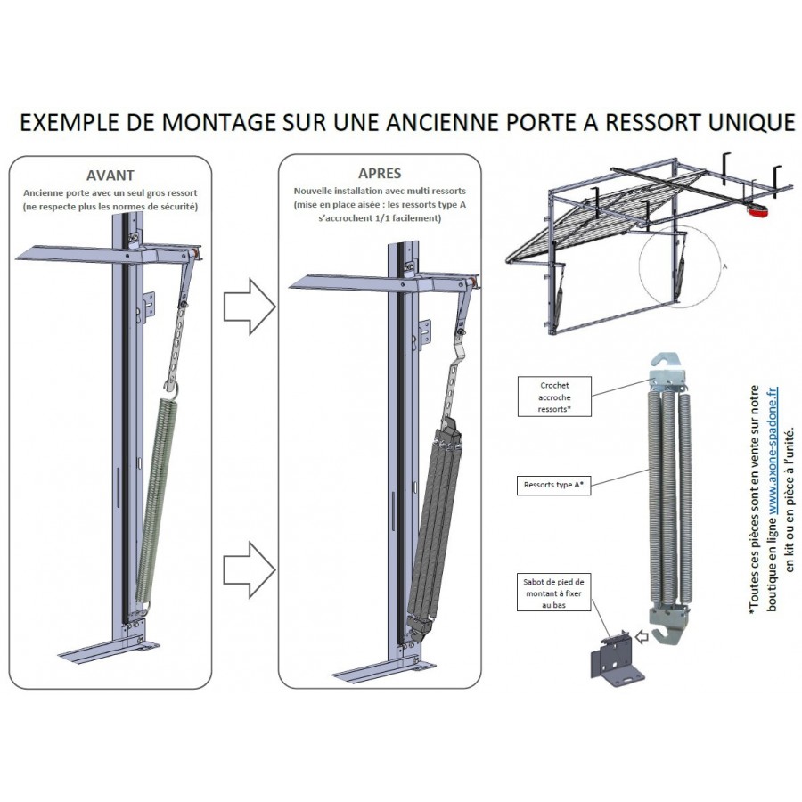 Die alten "großen Federn", die einzeln auf jeder Seite der älteren Schwingtore angebracht waren, entsprechen nicht mehr den aktuellen Normen. Wir verwenden ein einziges Federmodell und variieren deren Anzahl. Diese Federn werden mit diesem Paar Haken montiert.