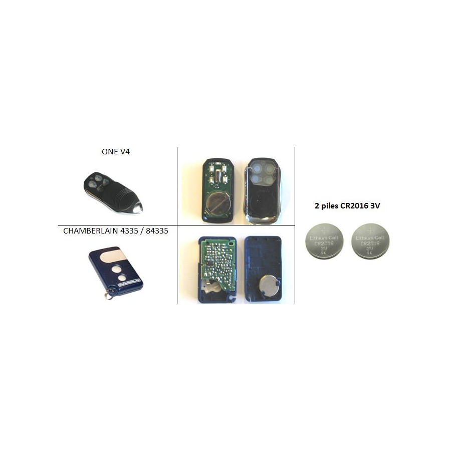 Um die 3V-Batterien CR2016 bei ONE V4-Garagentorsendern zu ersetzen, entfernen Sie die kleinen Schrauben auf der Rückseite des Senders und nehmen Sie das Gehäuse ab (achten Sie beim Einsetzen der neuen Batterien auf die Einlegerichtung der alten Batterien).
