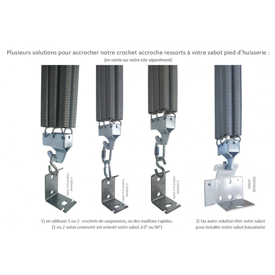 Les anciens "gros ressorts" uniques placés de chaque côté des portes de garage basculantes anciennes sont désormais hors-normes. Nous utilisons un unique modèle de ressort en faisant varier leur nombre. Ces ressorts sont assemblés grâce à cette paire de crochet.