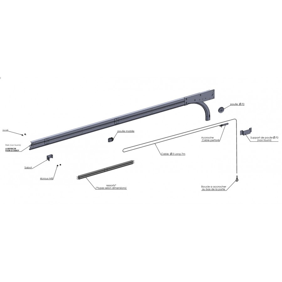 attention ce kit correspond a une porte de 2m de hauteur, pour un hauteur de 3m il faut ajouter une poulie en haut de la porte et donc ajouter 1/3 de câble , le câble du kit est suffisant .pour AXONE-SPADONE , le site ainsi que les conseils sont super , le pièces en 48 h sont la , sur des travaux en cour c'est super