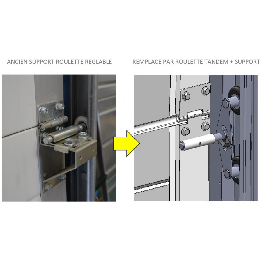 Ces roulettes tandem remplacent ainsi les anciens supports réglables installés sur les charnières tels que celui-ci :