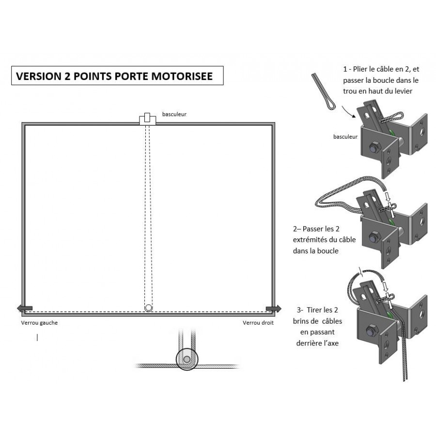 Ce kit de câblage permet de raccorder les deux pênes à claquer (placés dans chacun des coins bas de la porte, non fournis) avec le système de déverrouillage (placé au milieu haut de la porte, non fourni). L'action du moteur sur les verrous à ressort les libèrent pour permettre l'ouverture de la porte de garage.